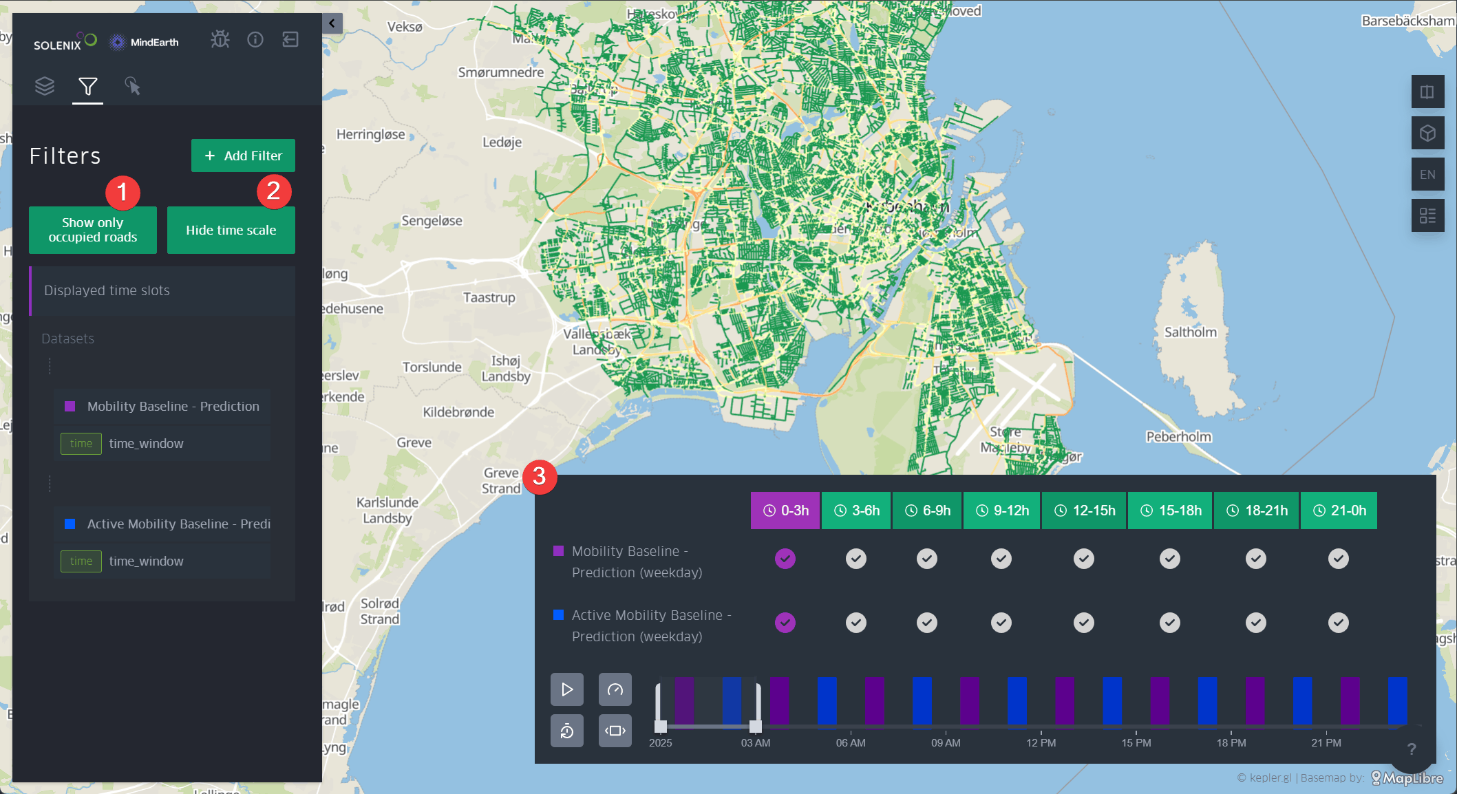 Additionally, it is possible to use the Filter tool to create dynamic animations as explained in figures previously. In this case, an example is shown of the parameters that can be set to create an animation of Road Occupancy. First, the user can activate the filter to only show the streets that are being occupied, therefore in hours with less traffic some streets will disappear of the map as there are no vehicles passing by. Then, using the time scale filter, the user can set the timeframes to be visualized in the animation. To ensure a smooth and continuous animation, it is recommended to set the playback button to cover a minimum timeframe of 3 hours (Figure 24).