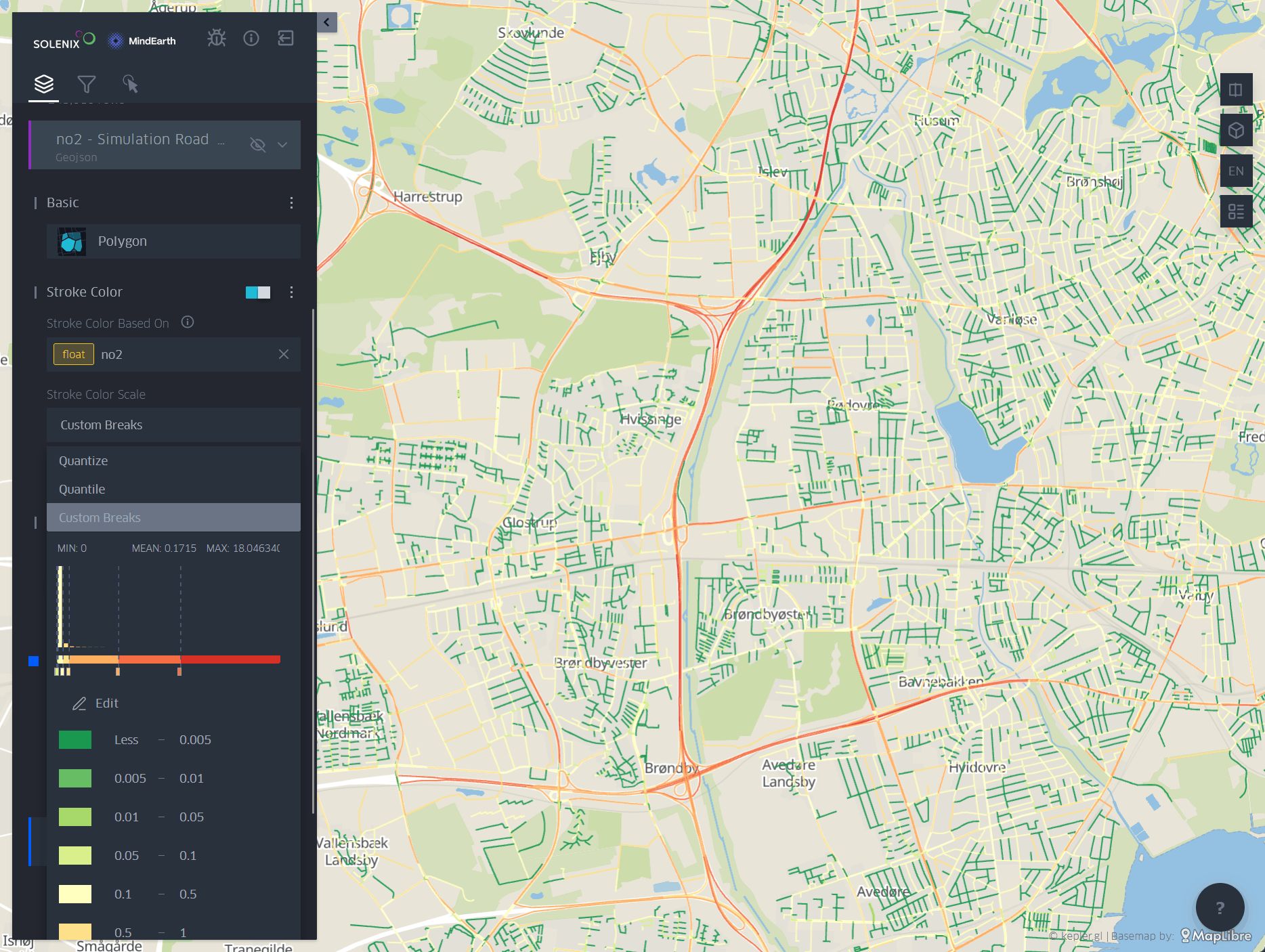For example, the figure below shows a comparison of NO2 between the baseline and the LEZ Emission scenario in Copenhagen. Since there are several layers open, the user might scroll down through the legend to check the values for each layer. There is also the possibility to hover over the layers to see additional information. The user can display another scenario for comparison, and therefore explore the same layer under different simulations and urban contexts (e.g. compare CO2 levels in a baseline scenario vs high-speed road redesign).