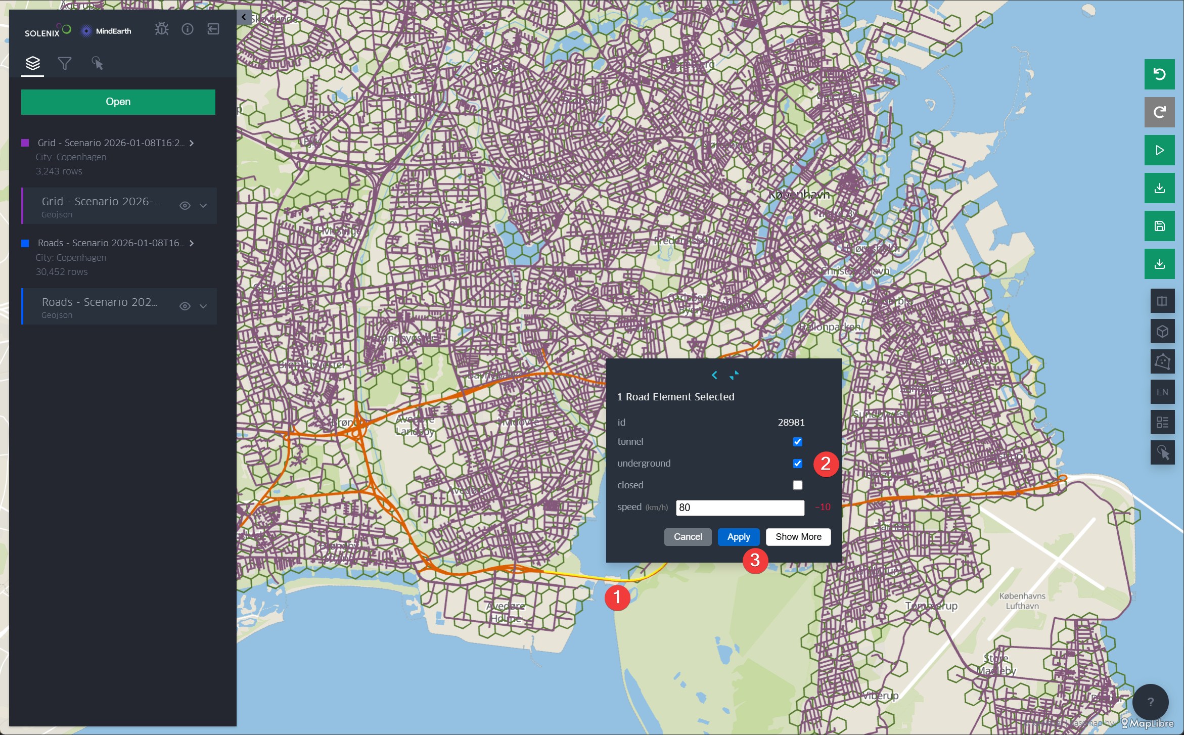 When loading a scenario, the map is populated with the scenario’s grid and road data and provides the user with several features to interact with and visualize the data.