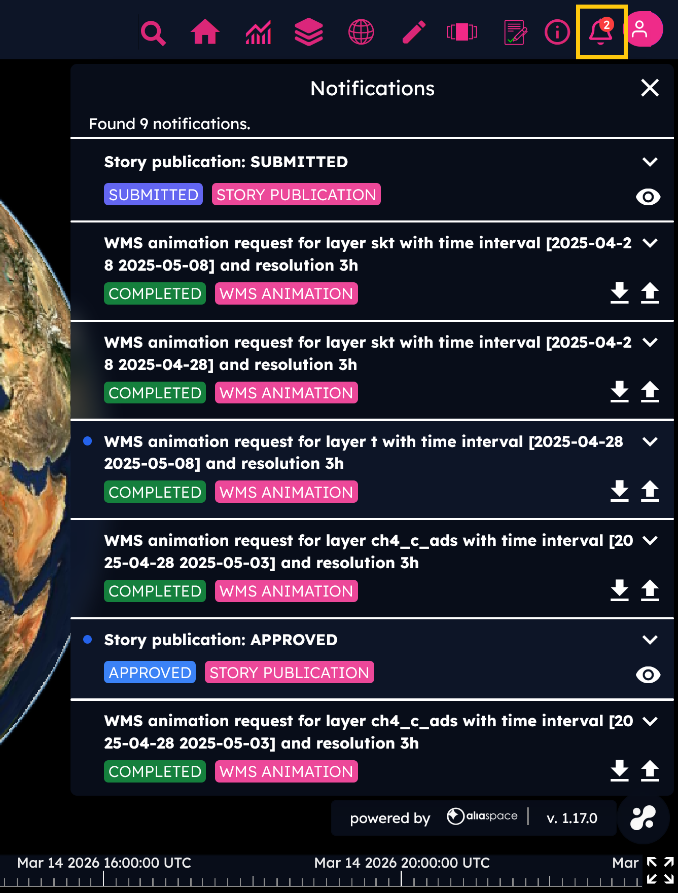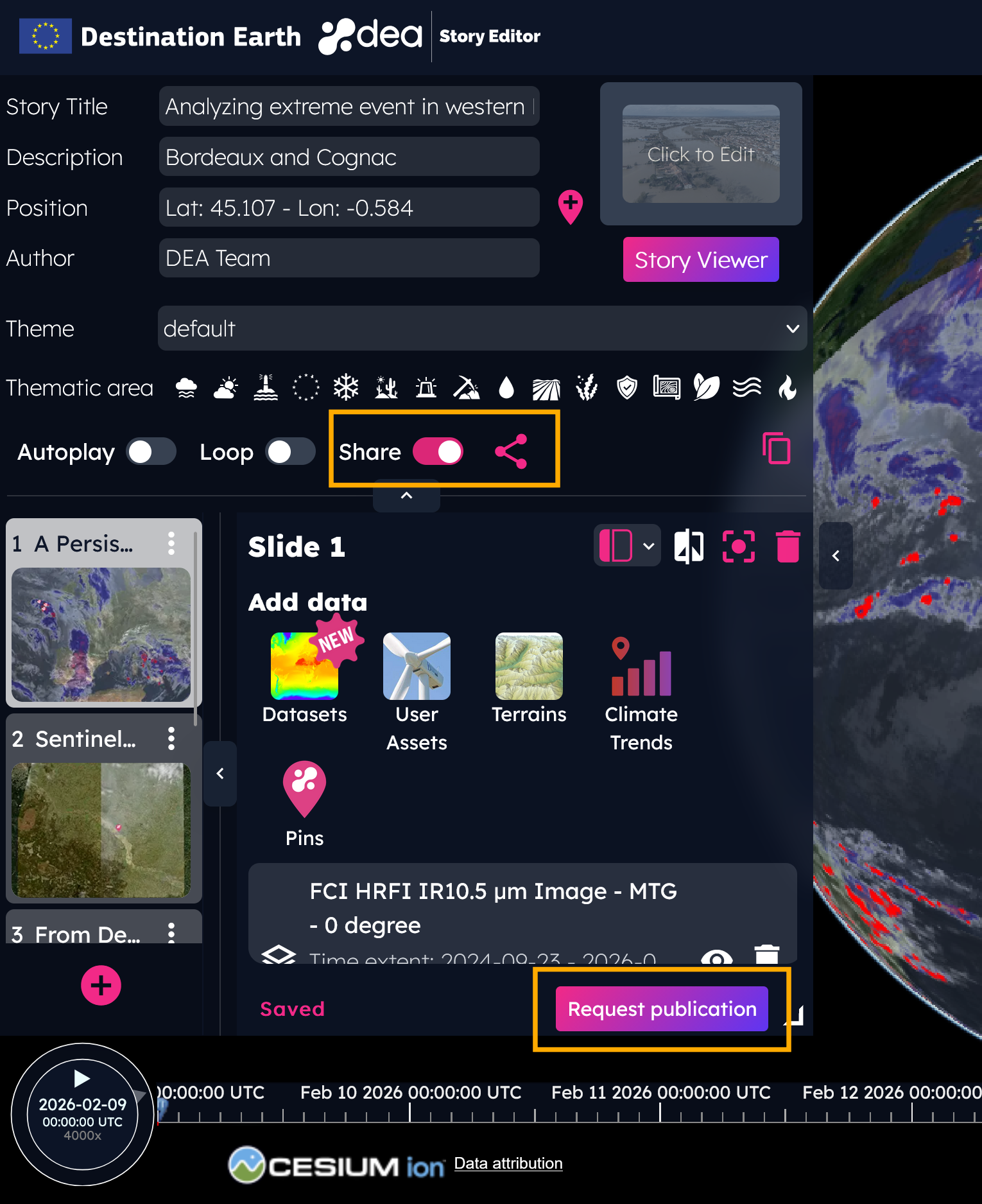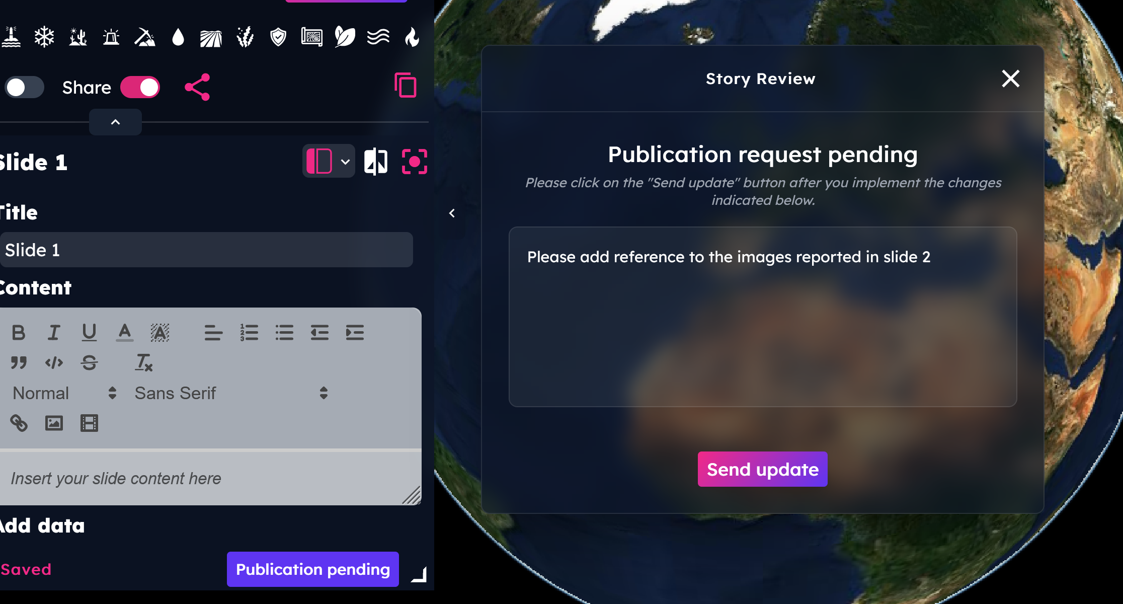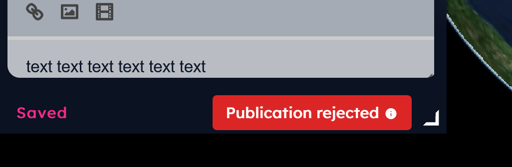 Approved: in this case, the story will be published on DEA. Once published, the user can no longer edit it. To request changes, the user can contact the DEA support at dea-support@alia-space.com.