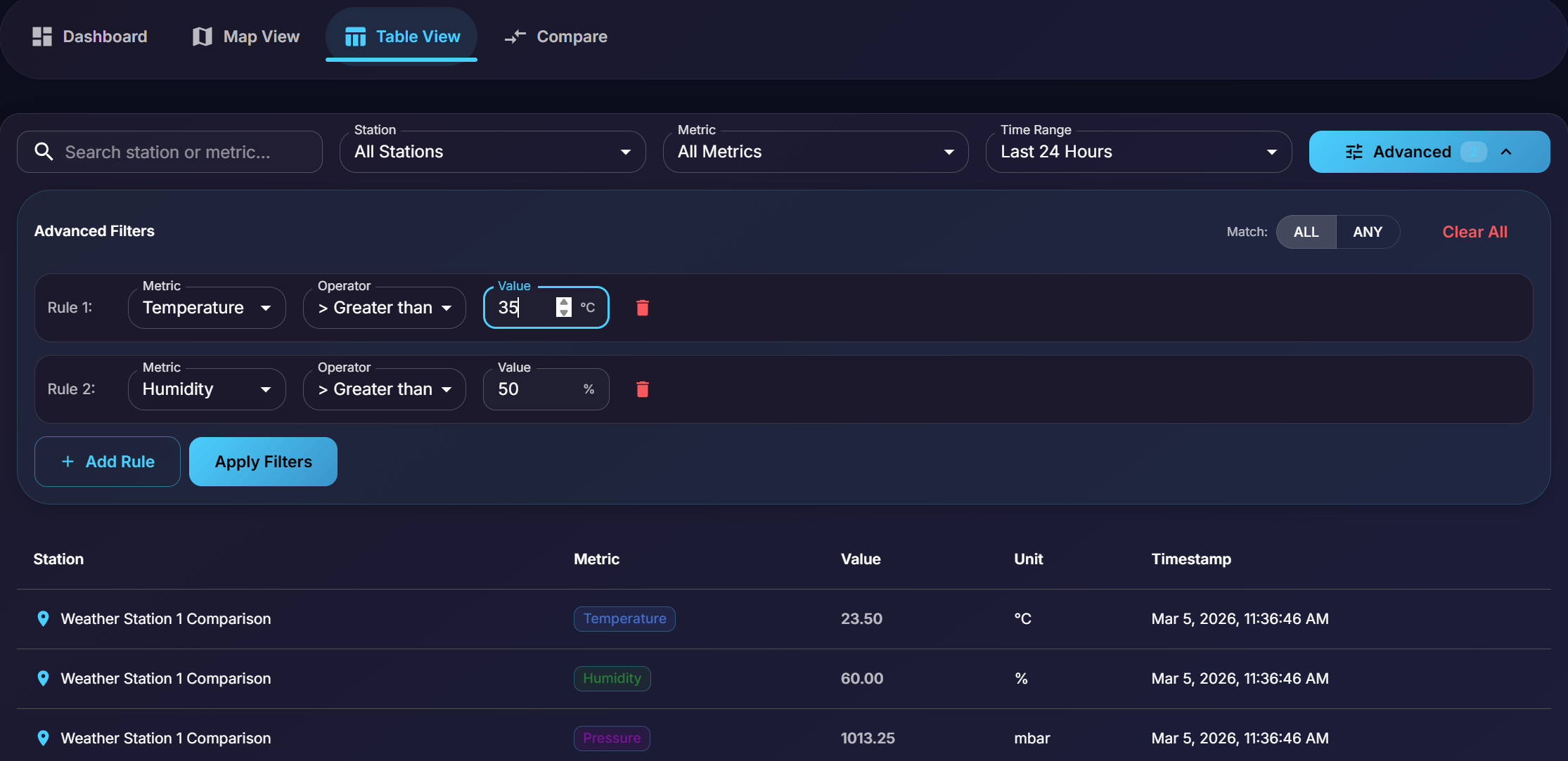 Metric Filter: A dropdown menu to isolate specific types of data (e.g., view only “Temperature” readings from all stations).