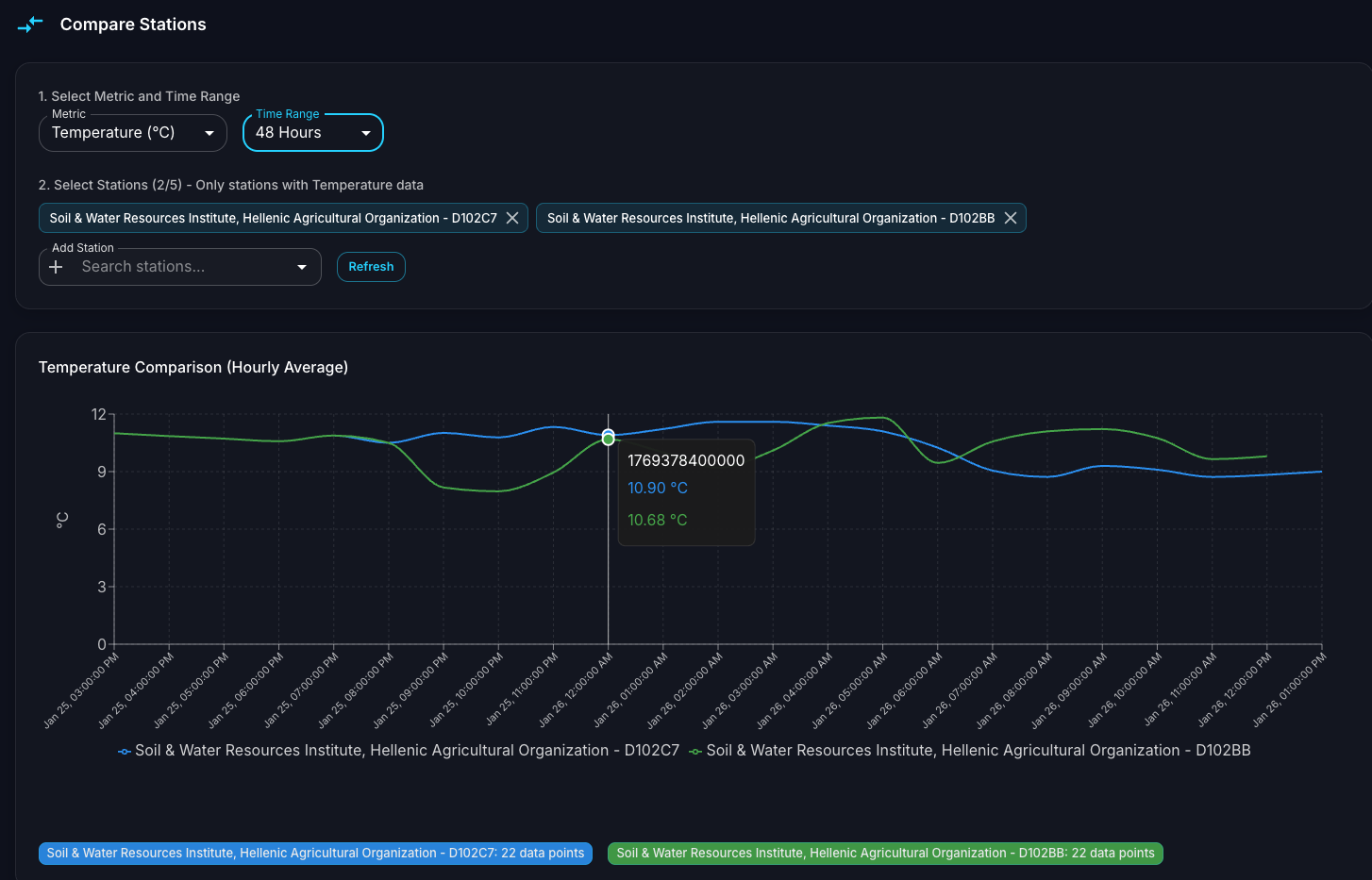 This feature enables users to quickly identify correlations, discrepancies, or anomalies between stations monitoring similar environmental conditions.