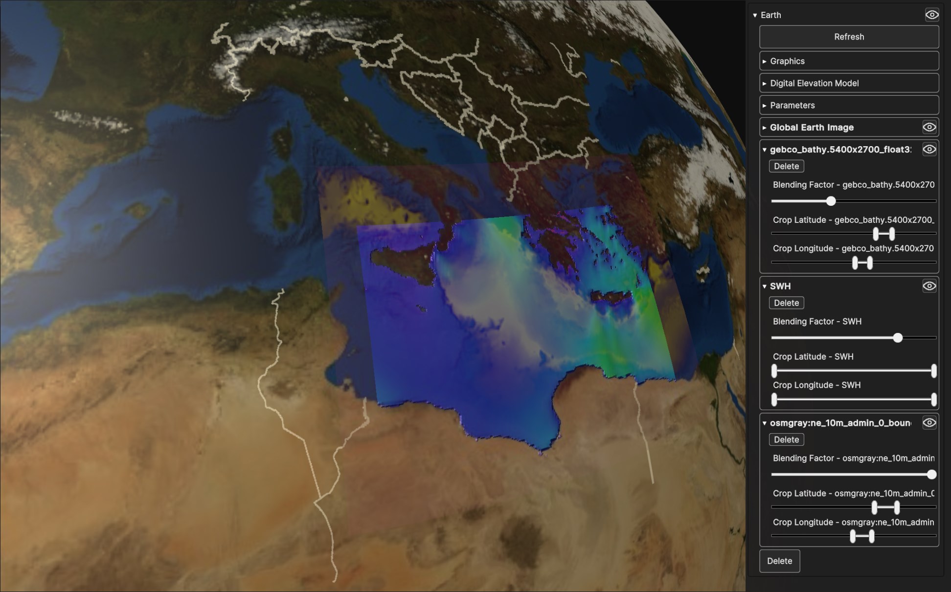 Fig. 5.10 Four blended Data Sources on a Surface Layer Geometry: Global Earth Image, gecho_bathy.5400x2700_float32, Daniel SWH and osmgray:ne_10m_admin_0_boundary_lines_land.png