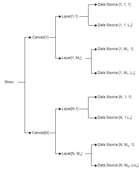 A Show is the root of the hierarchy tree of a 3D scene, consisting of Canvases, Layers, and Data Sources, as shown in the following diagram :