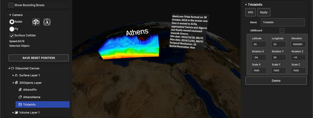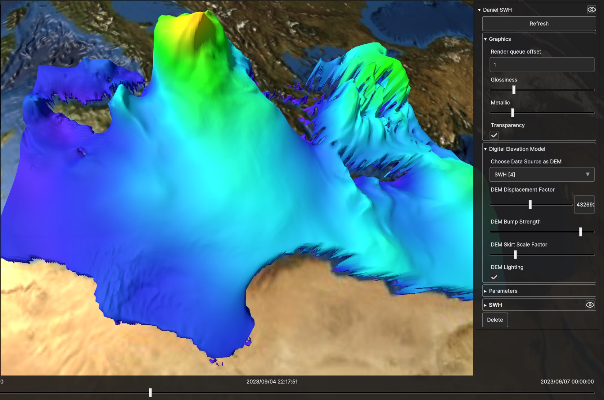 Using the timeline, user can navigate the dataset in time. Clicking on the layer card in the hierarchy tree shows the layer settings in the inspecor on the right.