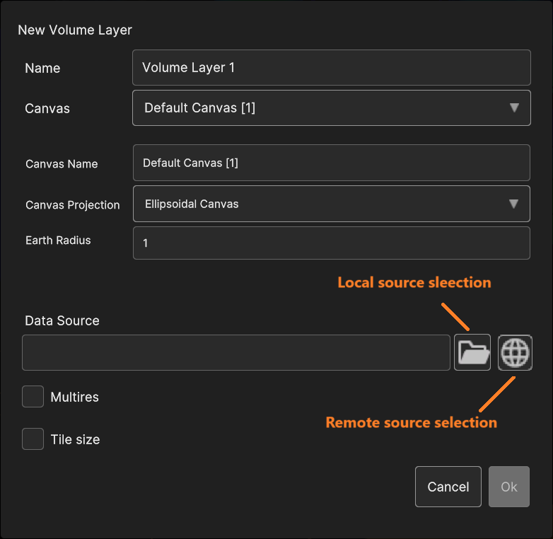 To add a volume layer, go to “Add Layer” > “Volume”. Then select a data source from local storage or from an external source. Refer to This Chapter > Data Sources for details.