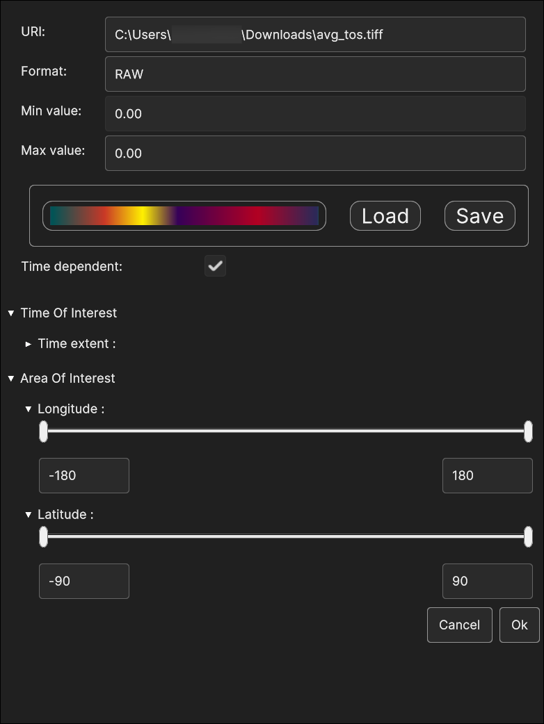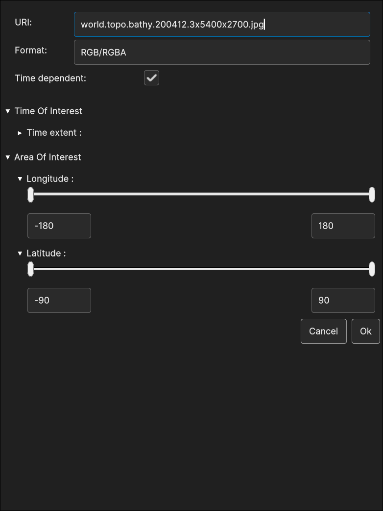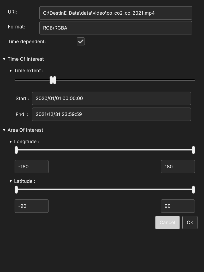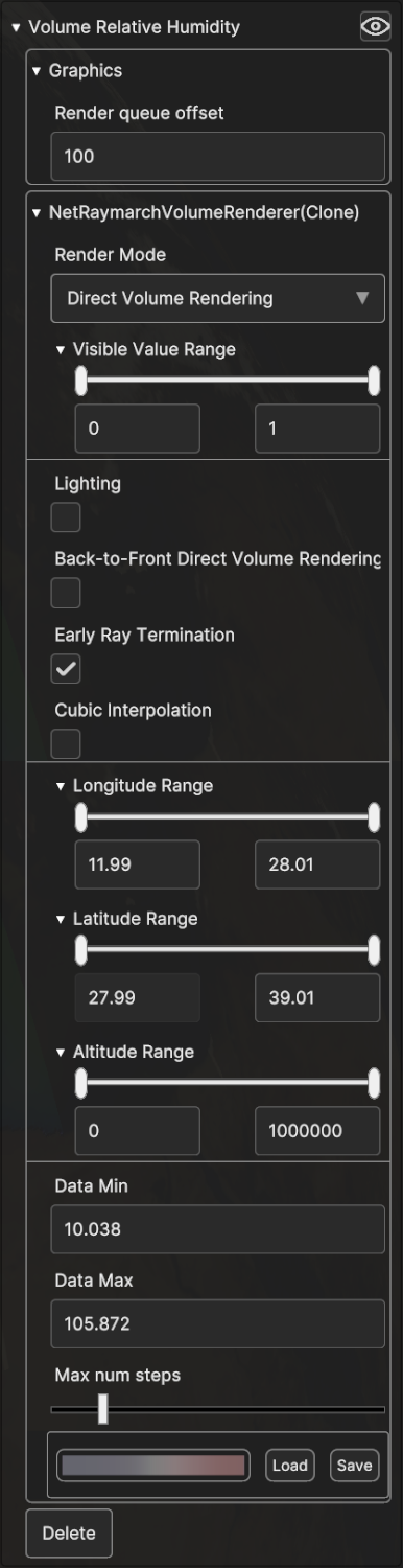 Longitude Range, Latitude Range and Altitude Range allow to slice the volume cube by moving the planes orthogonal to the Longitude, Latitude and Altitude dimensions.