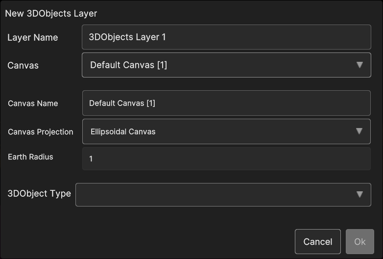- If New Ellipsoidal Canvas or New Planar Canvas is selected, three 3D Object data source types can be created:
