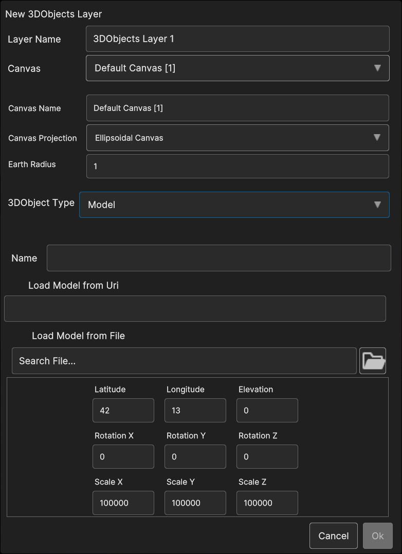 If 3D Objects menu item is selected, a popup appear in order to let the user choose the canvas type and the specific 3D Object data source that will be added to the layer.