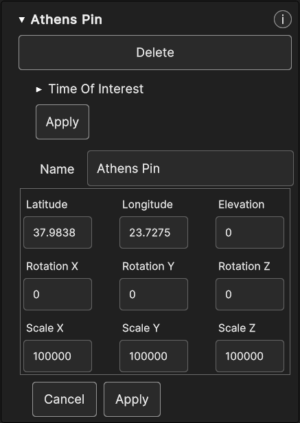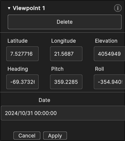 The Viewpoint Inspector Panel allows to delete the viewpoint with the specific button and it shows the same editable properties found in the popup panel. Changes can be discarded or confirmed with Cancel and Apply.