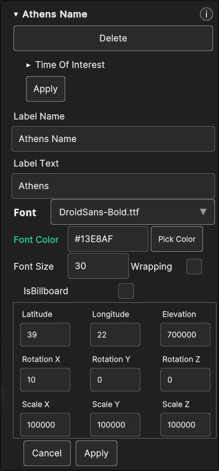 IsBillboard: if the checkbox is checked, the label will behave as a billboard (the label keeps itself oriented towards the camera), otherwise the label orientation will be static