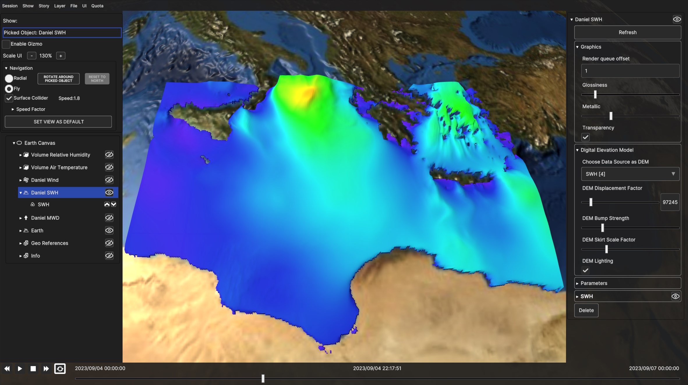 When a volume layer is added to the visualization, it appears on the map and a new item will be added to the canvas hierarchy panel. As for the other layer types, by interacting with the timeline, user can navigate the dataset in time, and by clicking on the layer item in the hierarchy tree, the layer visualization settings will appear in the right part of the user interface.
