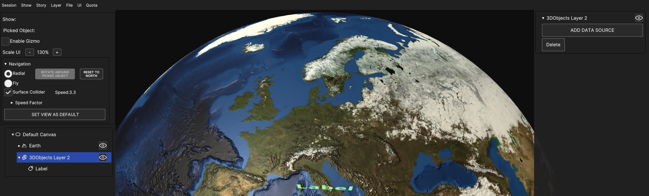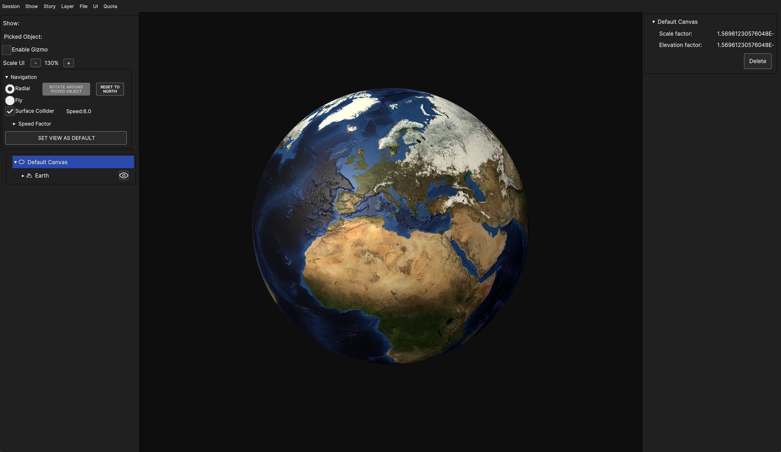 To navigate the 3D scene at very low altitudes, close to the Earth’s surface, it’s recommended to disable the “Surface Collider” checkbox in the Camera panel and switch the navigation type to Fly (see chapter 2.2 Camera Panel).