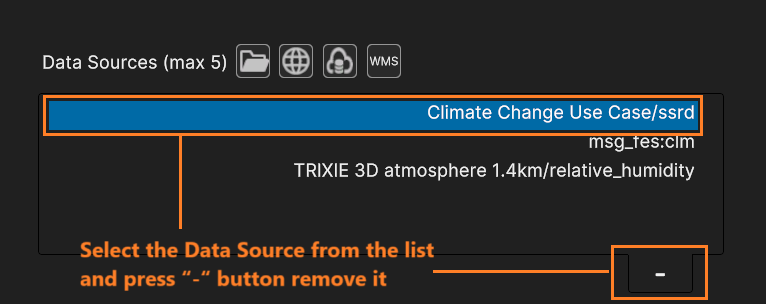 To remove an inserted Data Source, select it from the list and press the “-“ button at the bottom right of the list, as shown in the next figure. (when clicking on the globe icon, add “backend:// to the url field)