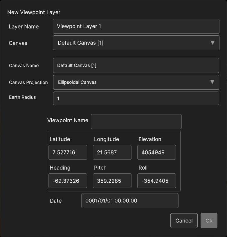 Clicking on the Viewpoint option opens the Viewpoint Layer panel. Here, beside the usual canvas and layer properties, user can set the name of the layer, the position and the orientation of the point, and the time instant.