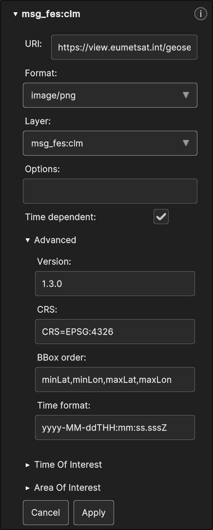 All the WMS parameters are exposed to the user, although only Options, BBox Order and Time format can be changed, other than the Time Of Interest and the Area Of Interest.