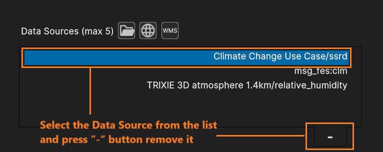 To remove an inserted Data Source, select it from the list and press the “-“ button at the bottom right of the list, as shown in the next figure.