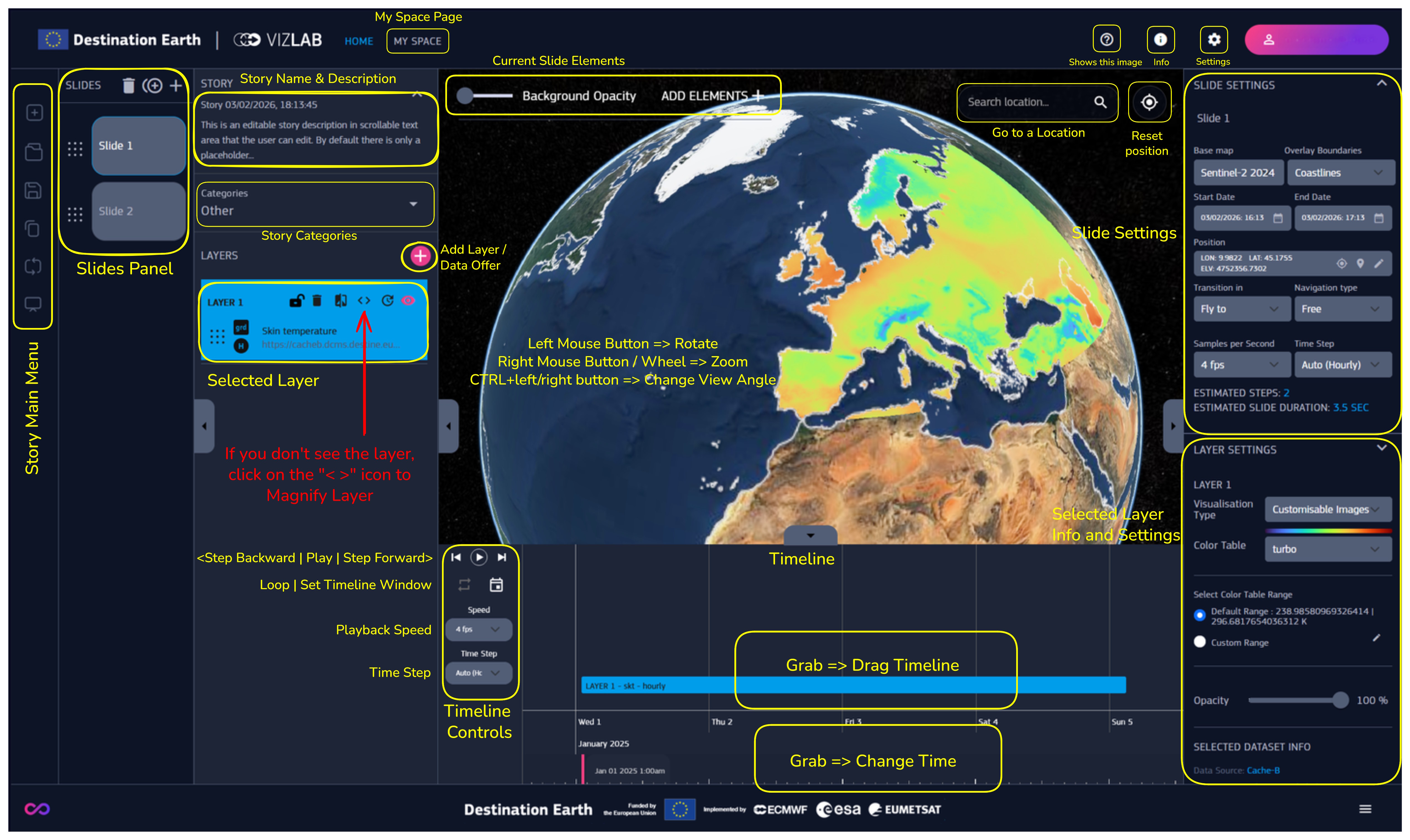 Diverse visualizations: Currently, layers support geodata in the form of maps, volumes, and streamlines. Users can combine data from different sources, extract specific areas, and define time intervals to enhance their storytelling at global, regional, and local scales.