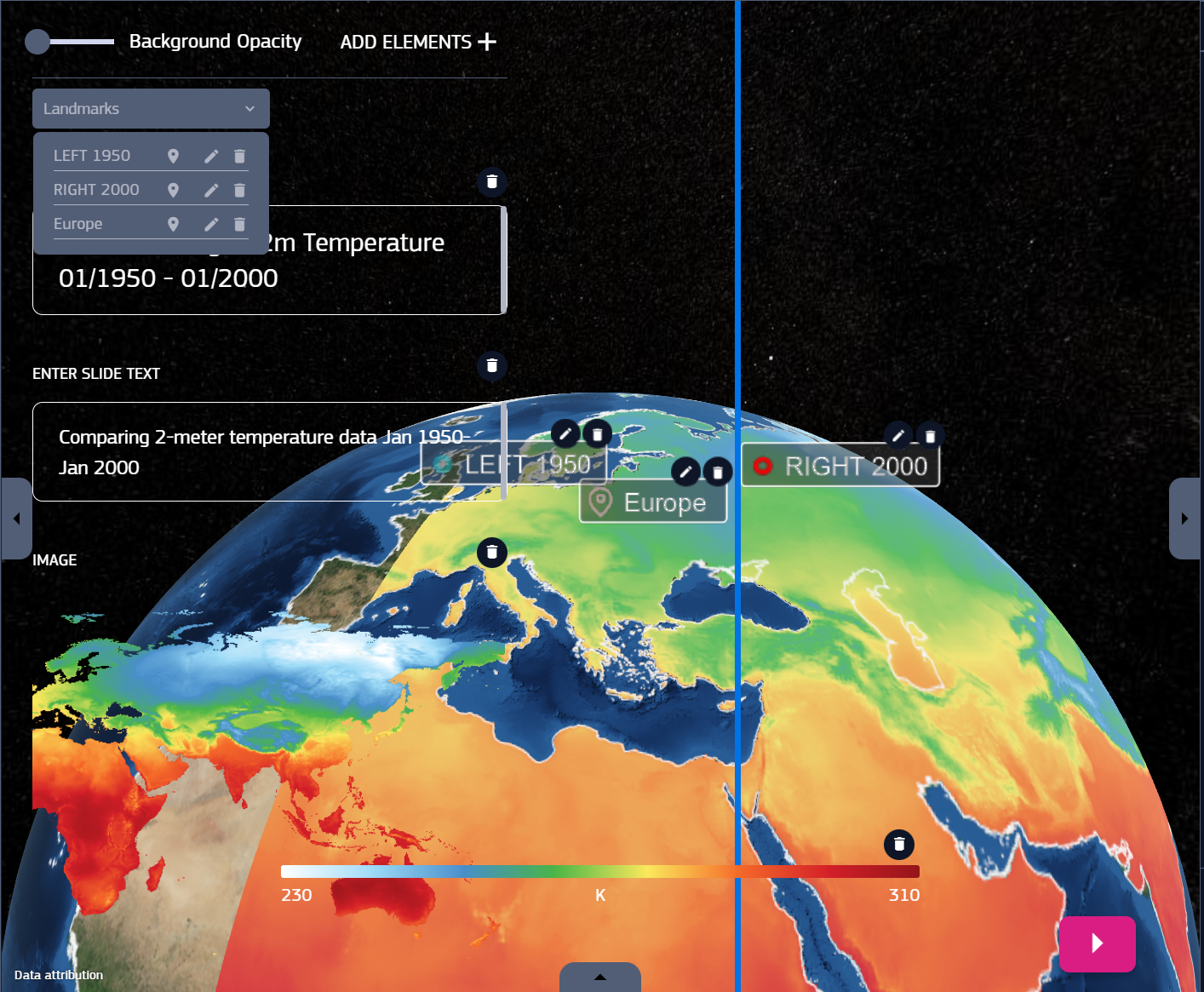 For each slide, Earth appearance can be changed by selecting the Base map, which is the image of the Earth wrapped around the 3D model.