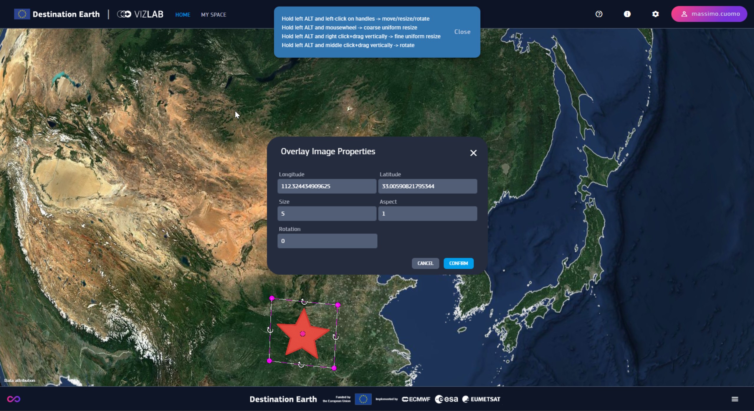 You can move overlay images by holding alt while dragging with the center handle, change size and ratio with the corner handles, or rotate them with the curved arrows. The full list of commands :