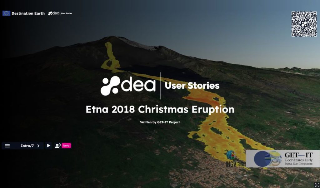 As part of the GET-IT (Geohazards Early Digital Twin Component) project, the 2018 Christmas eruption of Mount Etna – the volcano’s first flank eruption in a decade – was reconstructed through an interactive DEA story. Although the lava flow was relatively modest, the eruption was notable for its intense seismic activity and significant ground deformation, culminating in a magnitude 4.9 earthquake that affected nearby villages.
